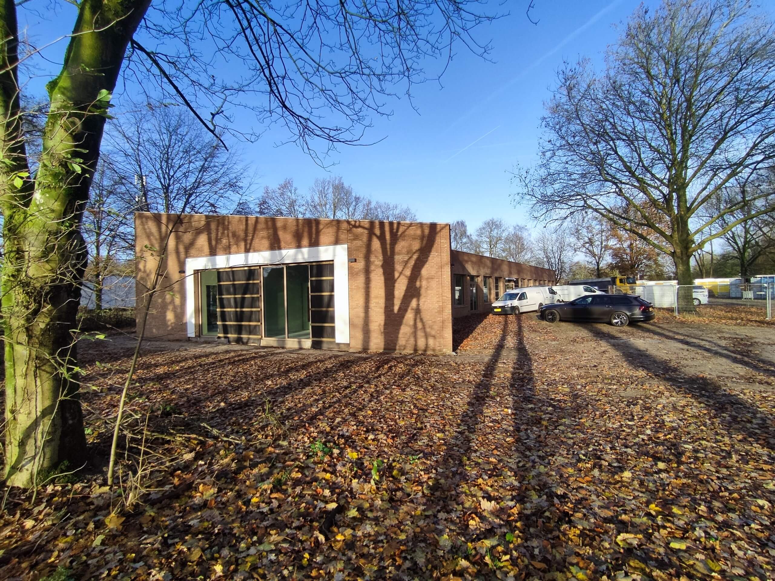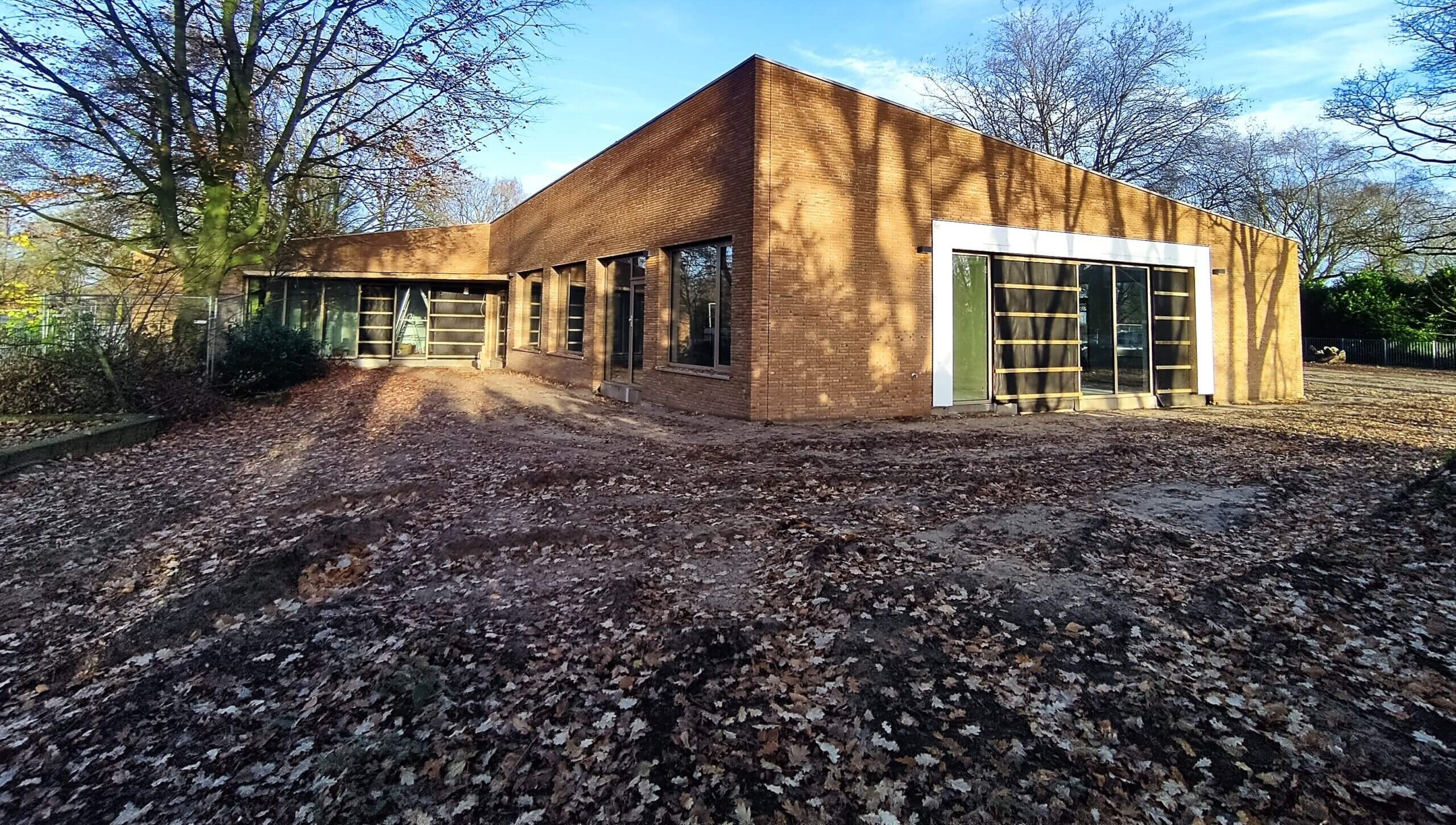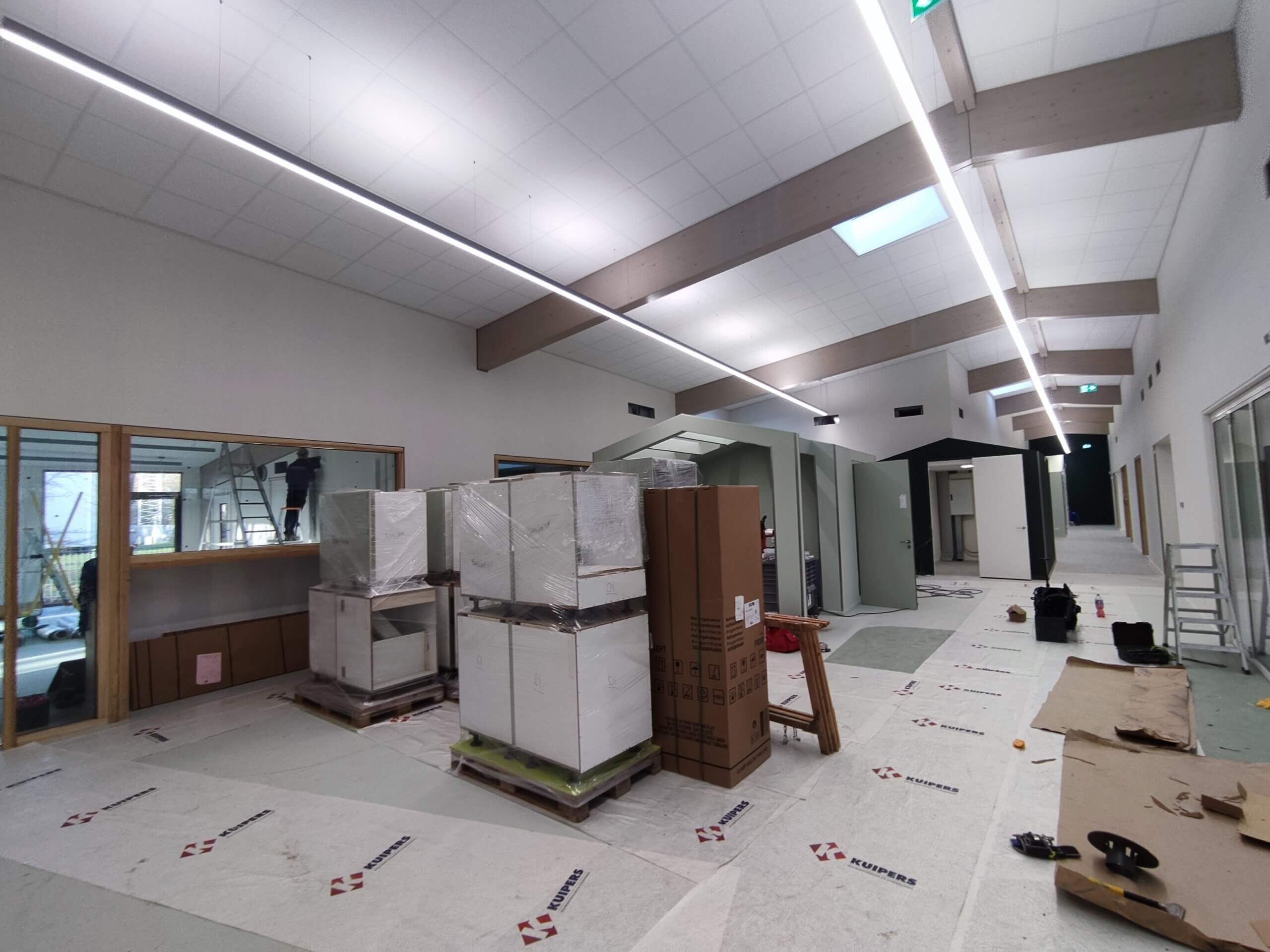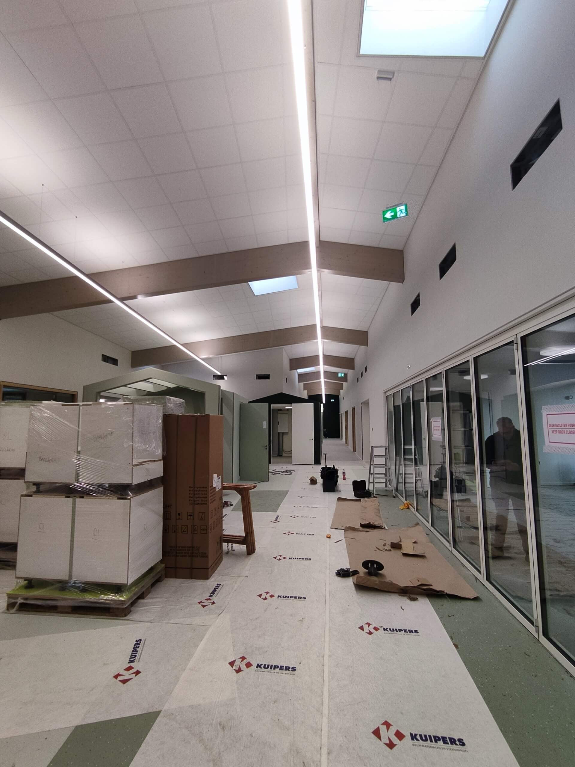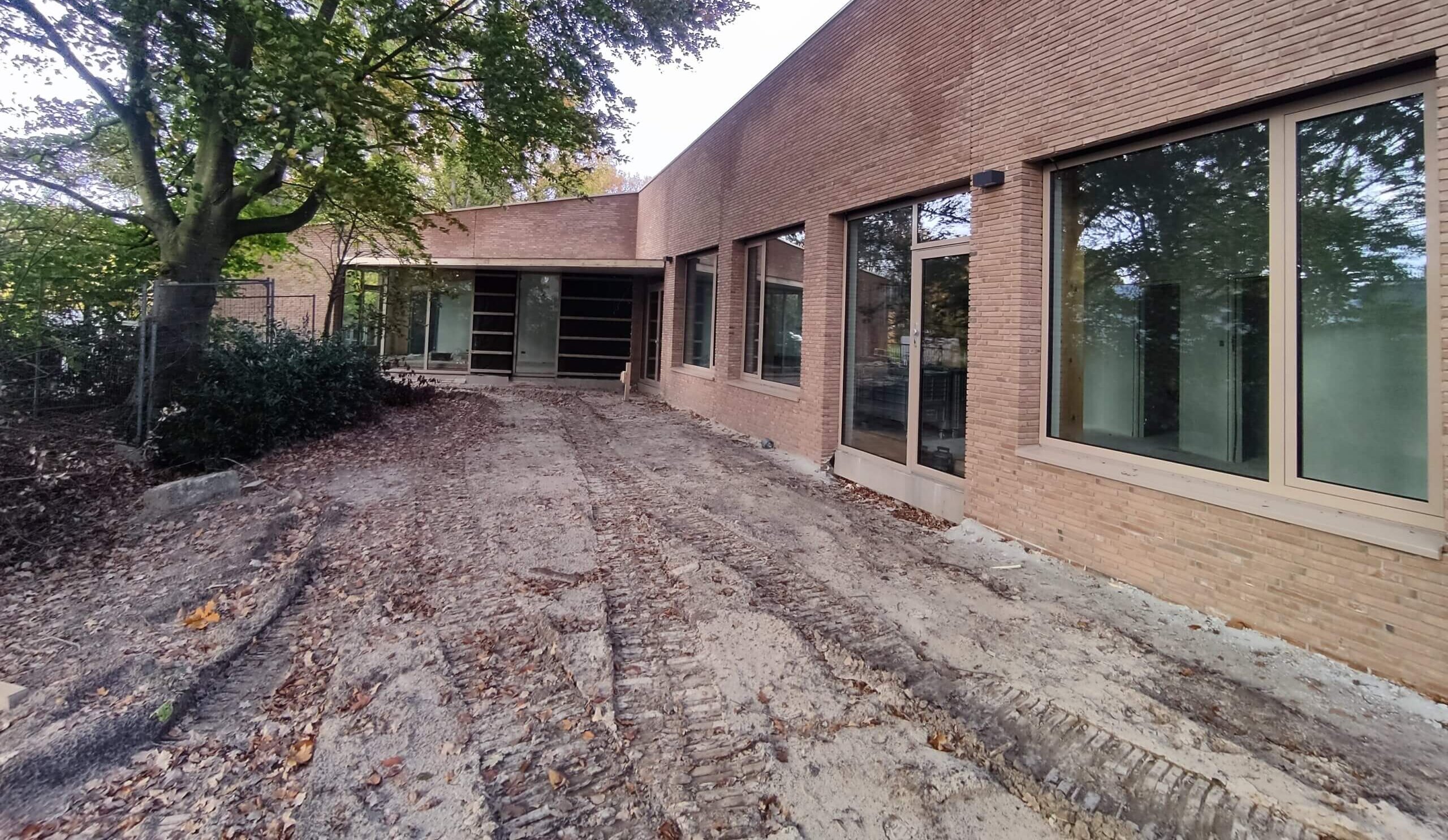 De basis voor het afdak bij de hoofdingang is goed te zien. Op het dak zien we de zonnepanelen liggen, die rondom de lichtkoepels zijn gedrapeerd.