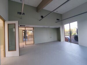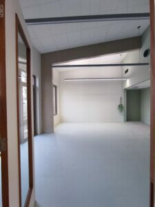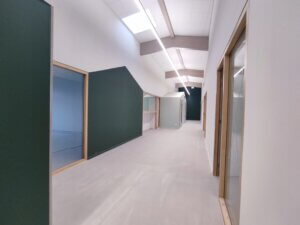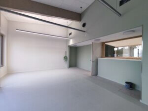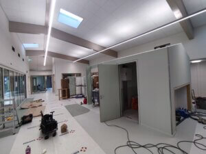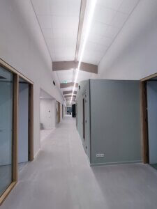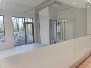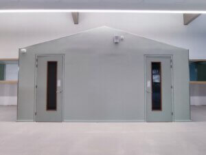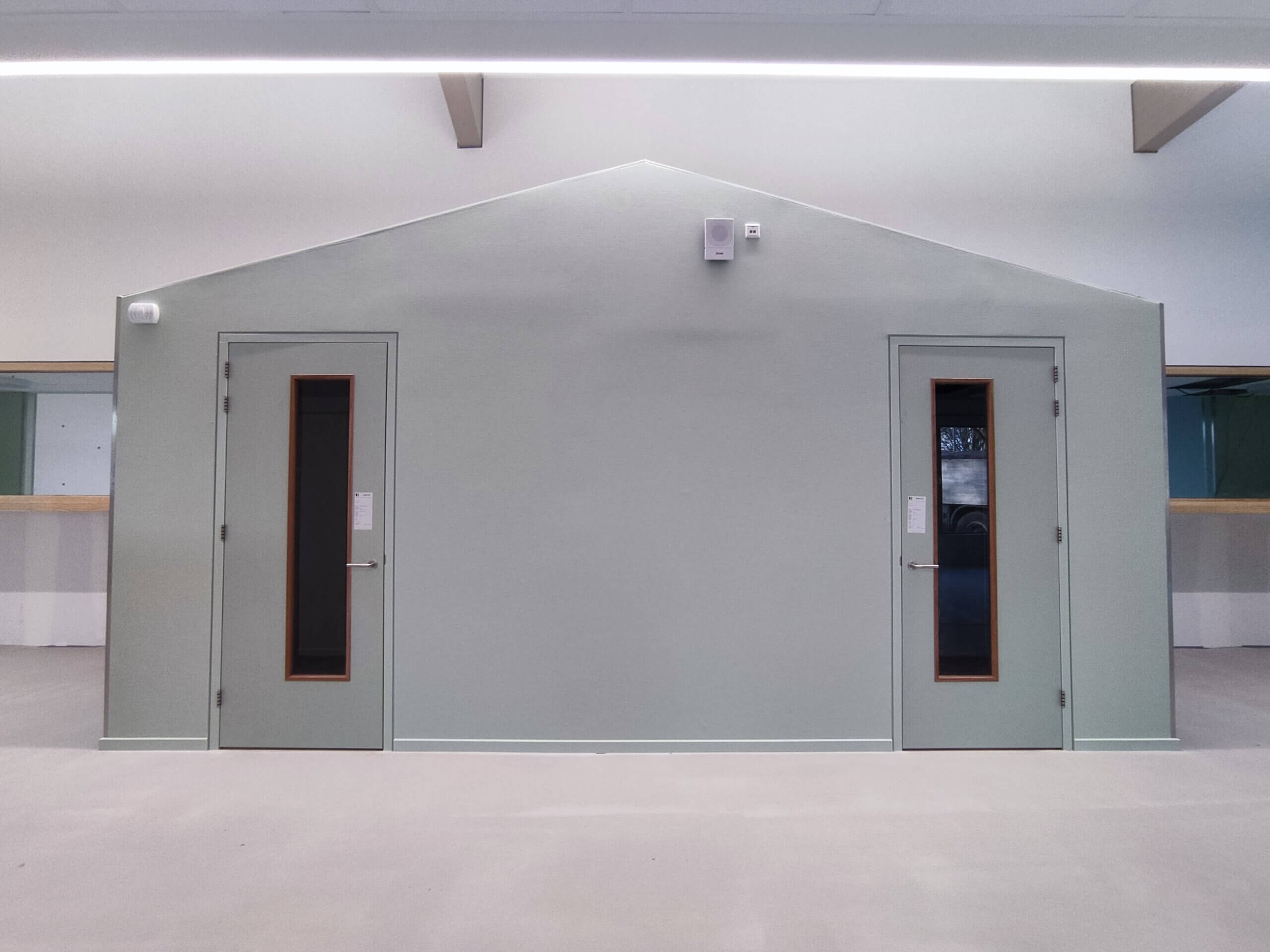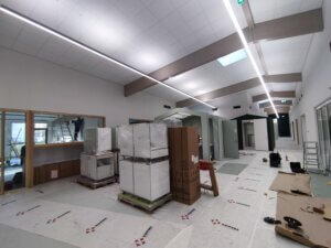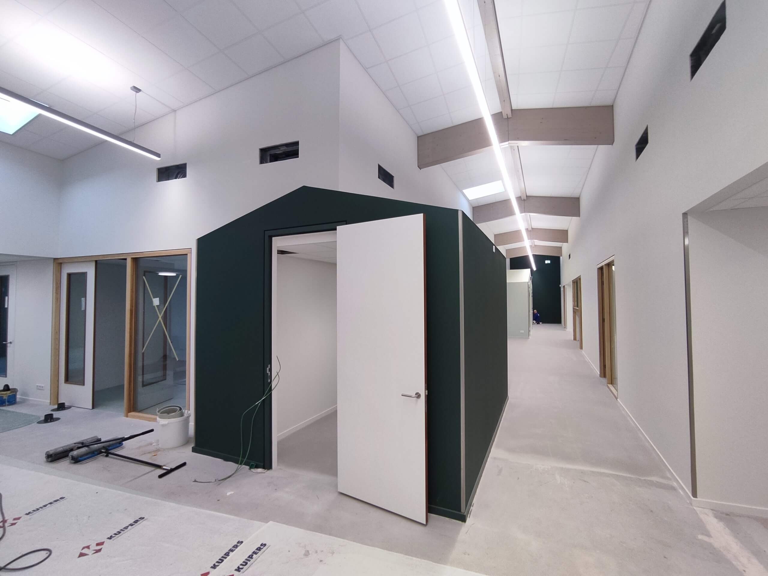 Binnen verschijnen verschillende tinten groen op wanden en huisjes en wordt de vloer gelegd. Lampen gaan langzaam aan als je een ruimte betreed en overal hangen kabels voor touchscreens, wifi punten en het wifi netwerk.